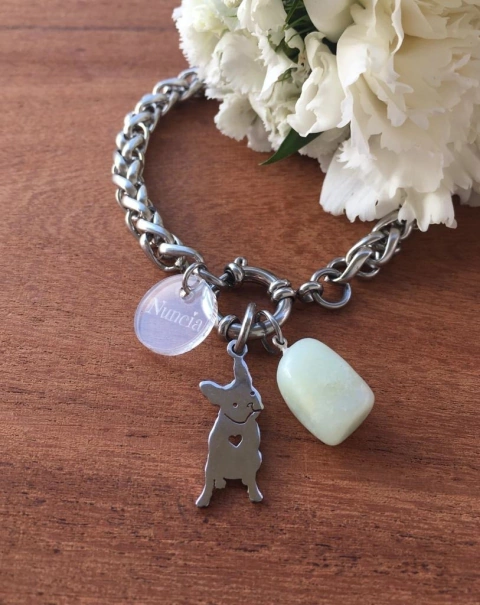 Pulsera y dije de acero quirúrgico con cierre marinero del mismo material. Piedra natural Amazonita. Medida de la pulsera 18cm. A tener en cuenta: las piedras pueden presentar leves variaciones en tono y forma ya que son naturales.