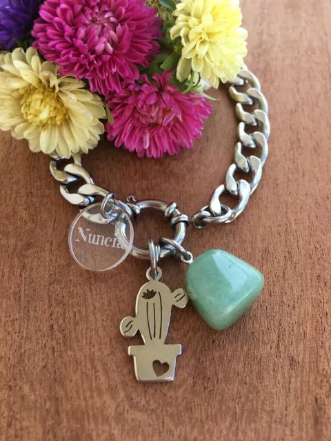 Pulsera y dije de acero quirúrgico con cierre marinero del mismo material. Piedra Natural Cuarzo verde. Medida de la pulsera 18cm. A tener en cuenta: las piedras pueden presentar leves variaciones en tono y forma ya que son naturales.