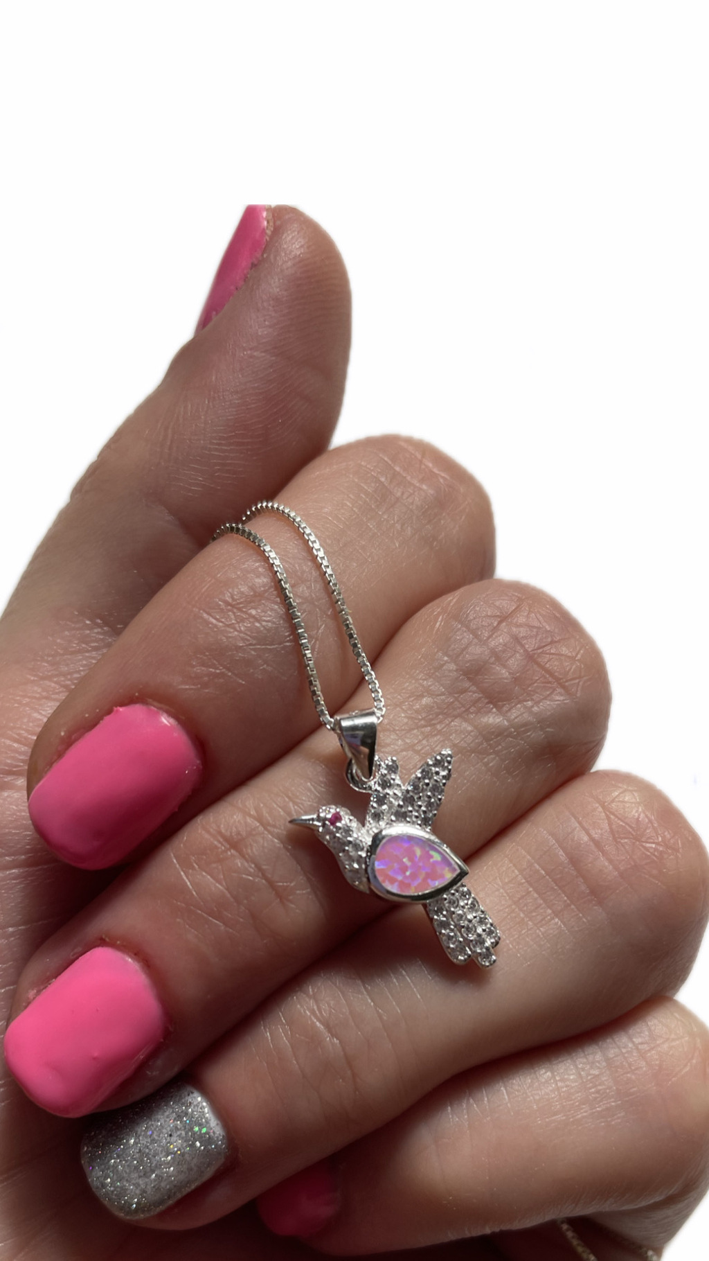 Conjunto. Cadena veneciana de 45 cm y dije colibrí con ópalo rosa y con cúbics engarzados. Plata 925.